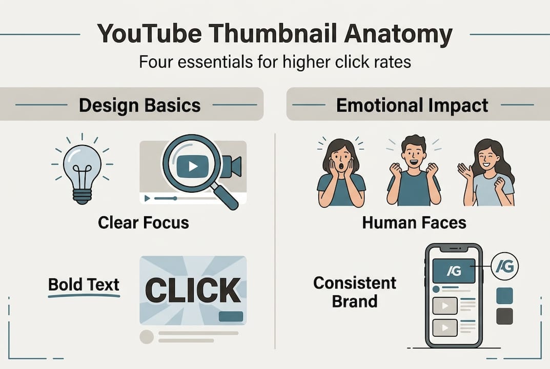 Effective thumbnails use clear focal points, bold text, and emotional cues to increase clicks. Each component serves a specific psychological purpose. Visual hierarchy determines what viewers notice first, guiding their eyes from the most important element to supporting details. Without deliberate hierarchy, thumbnails become visual noise that scrolls past unnoticed.